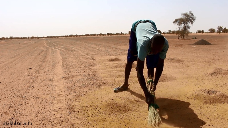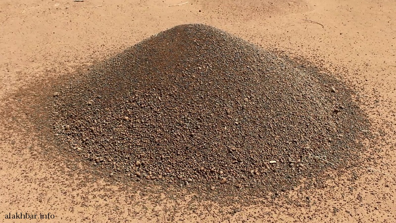 المكنسة التي يصنعها ولد محمود بيده من شجر البان “تيتارك/ أصَباي” تعينه في عملية التجميع الأولي للحجارة السطحية، وبواسطة الإناء المعدني يغرف من ما جمعت المكنسة.. يعتدل في وقفته ثم يسكب حِمله بتمهّل من علوّ مترين ونصف مستعينًا بتوازن مُحكم ـ وهو الذي لم يتلقّ يومًا درسًا في الفيزياء ـ بين الكمية المسكوبة وقوة الريح واتجاهها لعزل الحجارة عن الغبار.. شيئأ فشيئًا تسفر ساعات من العمل المتواصل عن كوماتٍ صغيرة من حجارة “اكرافييه” الخالصة.